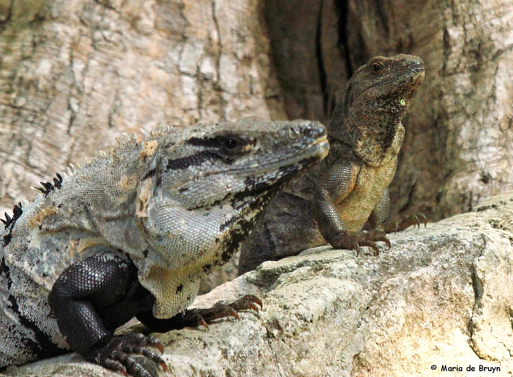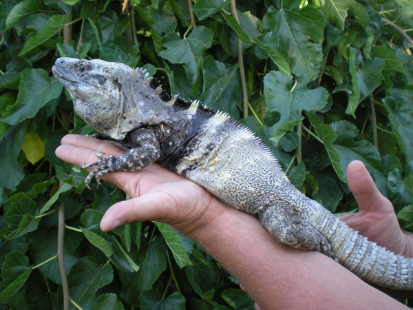 They have a striking black and white pattern like a cow black spiny tailed iguana. These iguanas are mostly black, but the dorsal areas may also have black bands on a gray background.